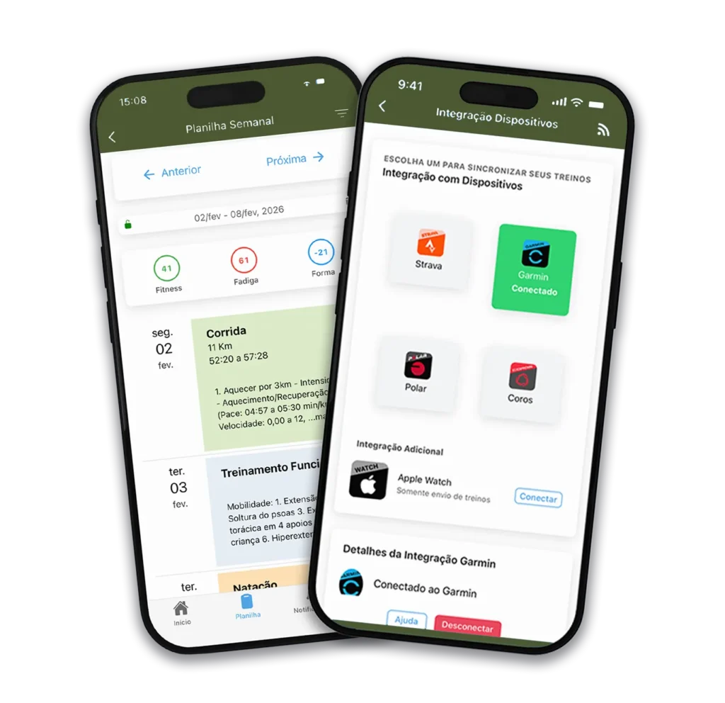 Você registra os treinos, envia feedbacks e acompanha sua evolução de forma simples e prática, com integração a dispositivos eletrônicos.